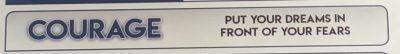 And so it was that, due to an event at a high school, I spent my waiting time reading my way through the history of the school’s achievements, displayed in pictures and trophies. Above the gymnasium, my eyes fell on this poster and I probably wouldn’t have noticed it much if I hadn’t had time, no internet reception and no book with me. The word “COURAGE” caught my eye. It’s one of those words that are the same in the two languages I use but are pronounced differently. And the explanation “put your dreams in front of your fears” immediately grabbed me. Fear…